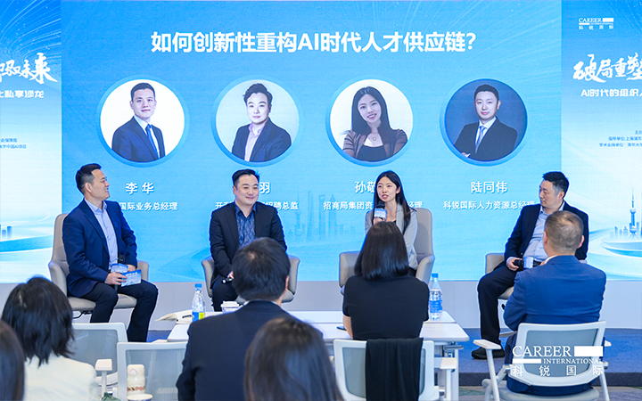 圆桌讨论环节,由凯发k8旗舰国际业务总经理李华主持,开利亚太总部招聘总监邹羽、招商局集团资深AI产品经理孙敬萍、凯发k8旗舰国际人力资源总经理陆同伟三位专家,分别从外资、央国企和民企视角,围绕AI时代人才供应链创新性重构话题展开深度对话。