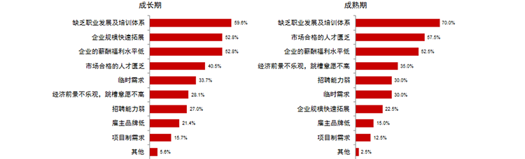 对于招不到人、留不住这个问题,我们发现无论是成长型还是成熟型企业,最重要的一项因素都是缺乏职业开展体系及开展路径,所以CFO和企业高管在做企业转换时,都更多关注于企业的开展和培训体系。